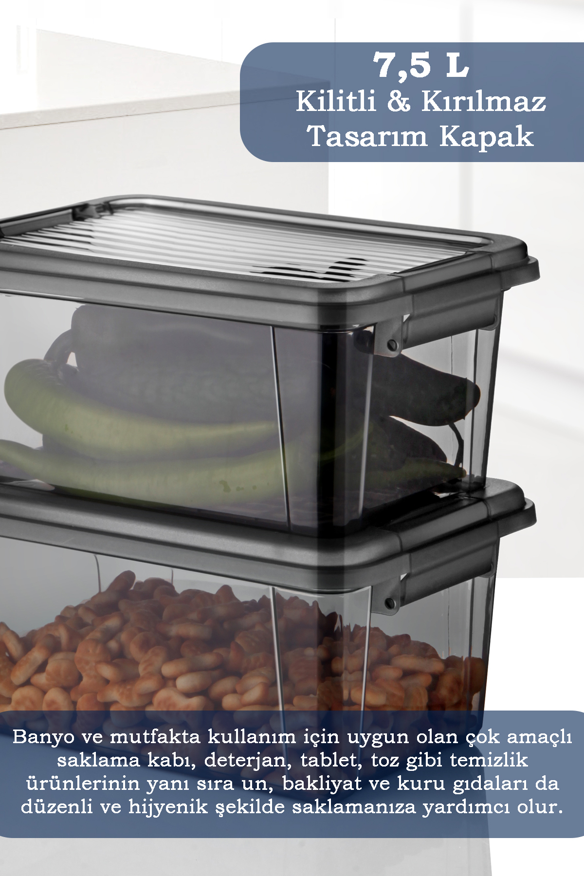 MOI Çok yönlü saklama kutusu ile mutfakta düzen, banyoda hijyen, kilerde ferahlık sizinle! MOI markasının pratikliğiyle tanışın, her şey yerli yerinde olsun.; MOI Kilit Kapaklı 7,5 Lt Saklama Kabı, ev düzenini kolaylaştıran pratik ve hijyenik bir çözümdür.; Hava geçirmez özel kapağı sayesinde içindeki ürünleri dış etkenlerden korur; nem, toz ve böcek gibi sorunlara karşı üstün koruma sağlar.; Bu çok yönlü kutu; toz ya da tablet deterjan, un, bakliyat, şeker, kuru gıda, kedi-köpek maması, hırdavat, oyuncak, hatta kiler düzeni için idealdir.; Minimal tasarımı sayesinde dar alanlarda kolayca yer bulur; modüler yapısıyla dolap, raf ya da baza altında üst üste konumlandırılabilir.; Ürün Hacim ve Ölçüleri:• 7,5 Litre: 22 x 21,6 x 14,4 cm – 2 Adet Kırılmaz kapak saklama kutusu – Siyah Kullanım Alanları:• Deterjan Kutusu: Toz veya tablet deterjanları düzenli ve kuru şekilde muhafaza eder.; • Erzak Kabı: Un, şeker, mercimek, pirinç gibi bakliyatları hava almadan saklar.; • Evcil Hayvan Mama Kabı: Kedi ve köpeklerin kuru mamaları tazeliğini koruyarak uzun süre muhafaza edilir.; • Hırdavat Kutusu: Çiviler, tornavidalar, küçük el aletleri için ideal saklama çözümü.; • Oyuncak Kutusu: Küçük oyuncaklar veya yapı parçaları için pratik depolama.; • Kamp ve Karavanlar için: Kompakt yapısıyla mobil yaşam alanları için idealdir.; Ürün Özellikleri:Hava Almaz Kilitli Kapak – İçeriği neme ve toza karşı korurSağlığa Uygun Malzeme – BPA içermez, uzun ömürlüdürKompakt Tasarım – Raf, dolap içi ve kiler için uygundurModüler Kullanım – Üst üste yerleştirilebilir, alan kazandırırŞeffaf Gövde – İçeriği kolayca görmenizi sağlar