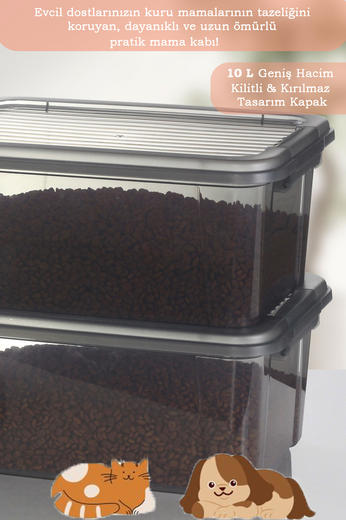 Evcil dostlarınızın sağlığı için tazelik ve hijyen çok önemli.; MOI Hava Almaz Mama Saklama Kabı ile hem düzenli bir mutfak hem sağlıklı bir mama saklama çözümü elinizin altında!Kilitli kapağı sayesinde hava ve nem geçirmez, mama uzun süre bayatlamadan muhafaza edilir.; Kedi, köpek veya diğer evcil hayvanların maması için idealdir.; Aynı zamanda bakliyat, erzak veya un gibi gıdalar için de kullanılabilir.; Ürün Özellikleri:Hava Almaz Kilitli Kapak: Özel kapak tasarımı sayesinde mama uzun süre taze kalır, böceklenme ve nem oluşmaz.10 Litre Geniş Hacim: Yaklaşık 3–4 kg mama saklama kapasitesiyle ekonomik paketler için idealdir.; Sağlam ve Dayanıklı Malzeme: BPA içermeyen, sağlığa zararsız kaliteli plastikten üretilmiştir.; Kolay Açılır/Kapanır: Pratik kapak sistemi ile kullanım kolaylığı sağlar.; Koku Yapmaz – Kolay Temizlik: Yüzeyi pürüzsüzdür, kolayca temizlenebilir.; Çok Amaçlı Kullanım: Mama dışında bakliyat, kahve, un, şeker gibi ürünlerin saklanması için de uygundur.; Ürün Ölçüleri:2 Adet – 10 Litre — 23,5 x 34 x 15,5 cm SiyahKullanım Alanları:• Kedi maması saklama kutusu• Köpek kuru mama kabı• Evcil hayvan yemliği kutusu• Karavan, balkon veya kilerde düzenleyici• Kamp gibi taşınabilir ortamlar