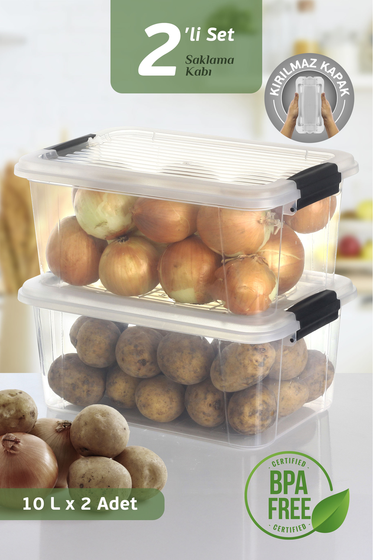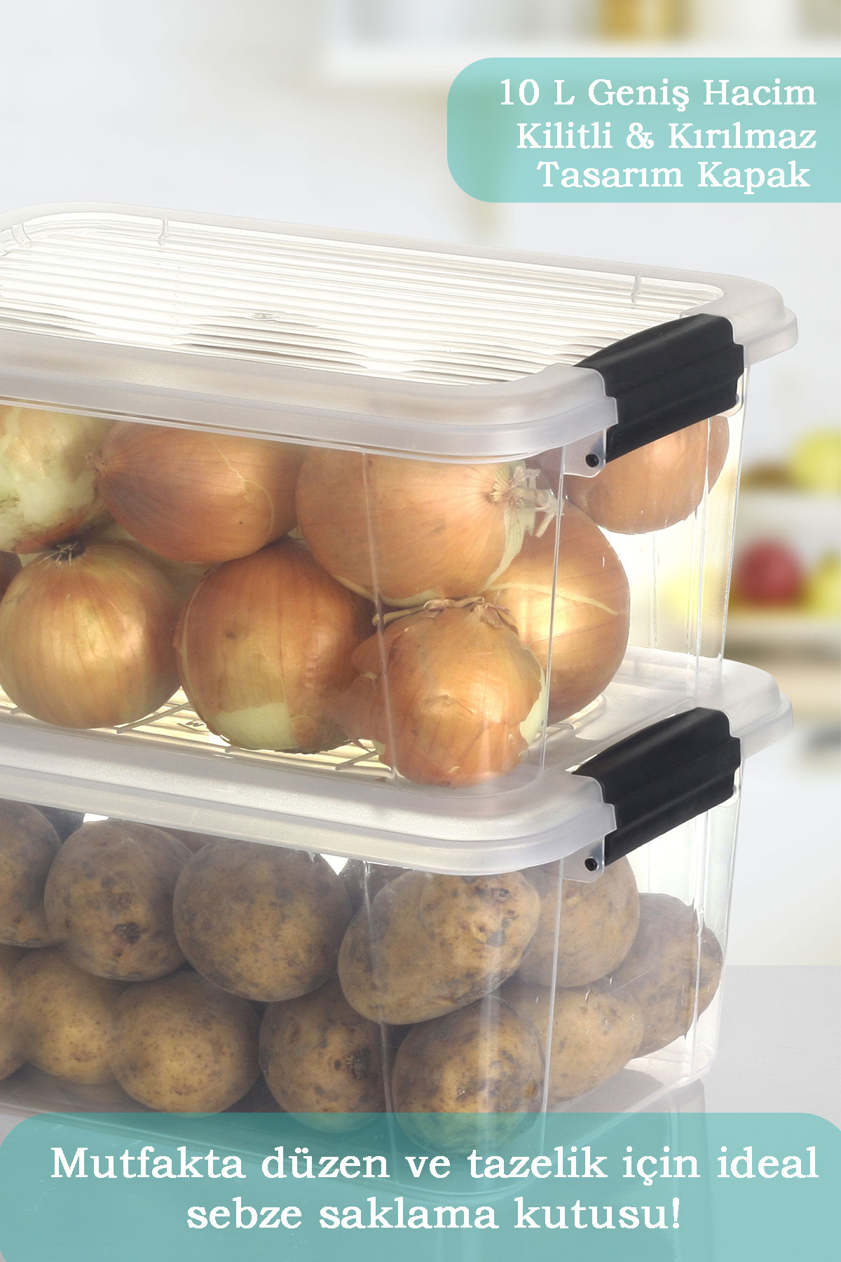 MOI 10 Litre Saklama Kutusu, mutfağınızda hem estetik hem fonksiyonel çözüm sunar.; Sebzelerinizi taze, alanınızı düzenli tutmak artık çok kolay!MOI 10 Litre Sebze Saklama Kabı, mutfakta hem düzen hem de tazelik arayanlar için özel olarak tasarlanmıştır.; Patates, soğan, havuç, limon, sarımsak gibi sebzeleri hijyenik ve düzenli şekilde saklamanızı sağlar.; Kaliteli plastik malzemeden üretilmiştir ve uzun ömürlüdür.; Kiler dolabı, mutfak rafı veya balkon alanlarında ideal kullanım sunar.; Ürün Hacmi ve Ölçüsü:2 Adet 10 Litre — 23,5 x 34 x 15,5 cm ŞeffafÜrün Özellikleri:Çok Amaçlı Kullanım: Patates, soğan, bakliyat, limon, sarımsak, kuru gıda ve daha fazlası için uygundur.; Kiler ve Baza Altı Uyumlu: Kompakt yapısı sayesinde dar alanlarda rahat kullanım sağlar.; Sağlam ve Dayanıklı Malzeme: Sert plastikten üretilmiştir, kırılmaya karşı dayanıklıdır.; Kolay Taşınabilir: Hafif yapısı sayesinde ev içinde kolayca yer değiştirebilirsiniz.; Tozdan Koruyan Kapak: Ürünlerinizi dış etkilerden korur, mutfağınızda hijyen sağlar.; Kolay Temizlik: Deterjanla veya ıslak bezle kolayca temizlenebilir.; Kullanım Alanları:• Mutfak düzenleyici• Kiler kutusu• Sebze ve meyve saklama kutusu• Erzak & bakliyat kabı• Balkon & depo saklama çözümü• Kamp & karavan gibi taşınabilir ortamlar