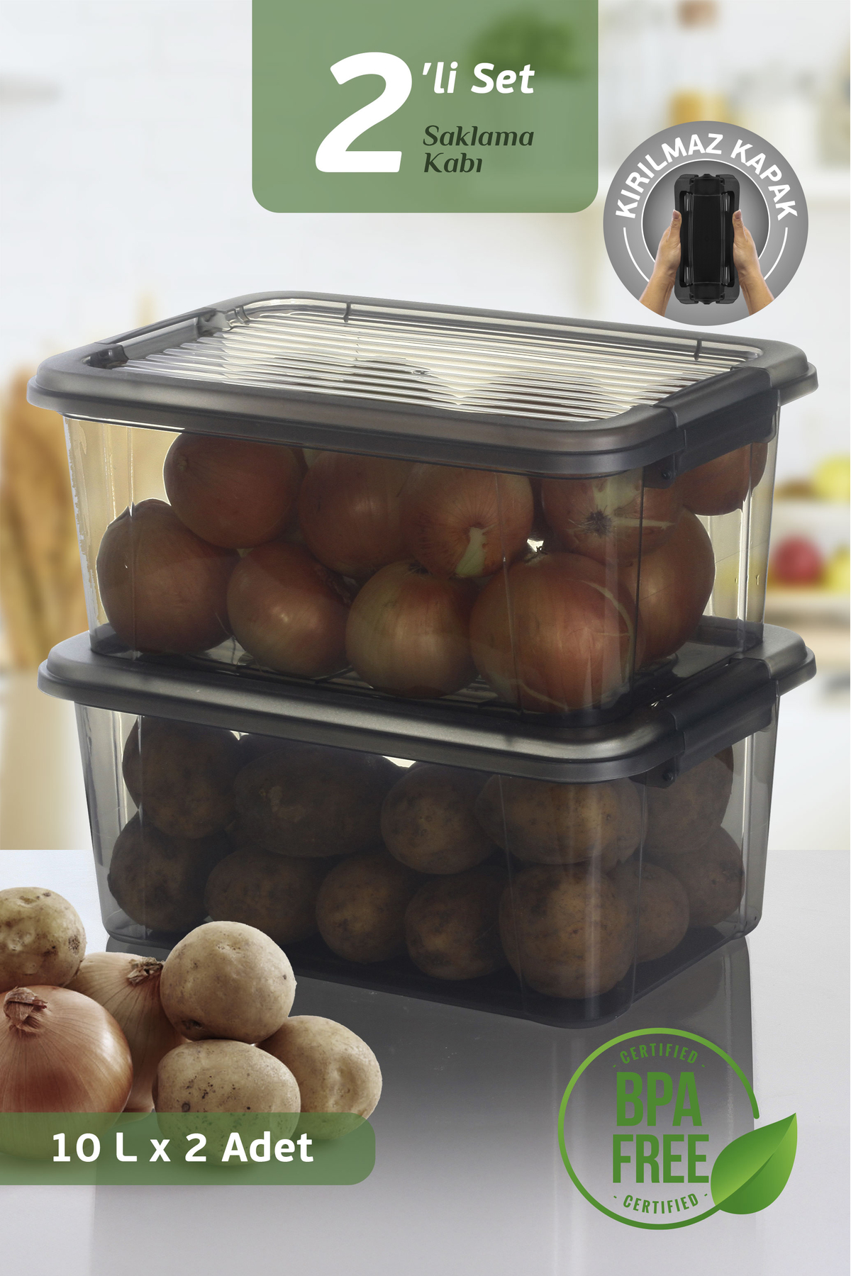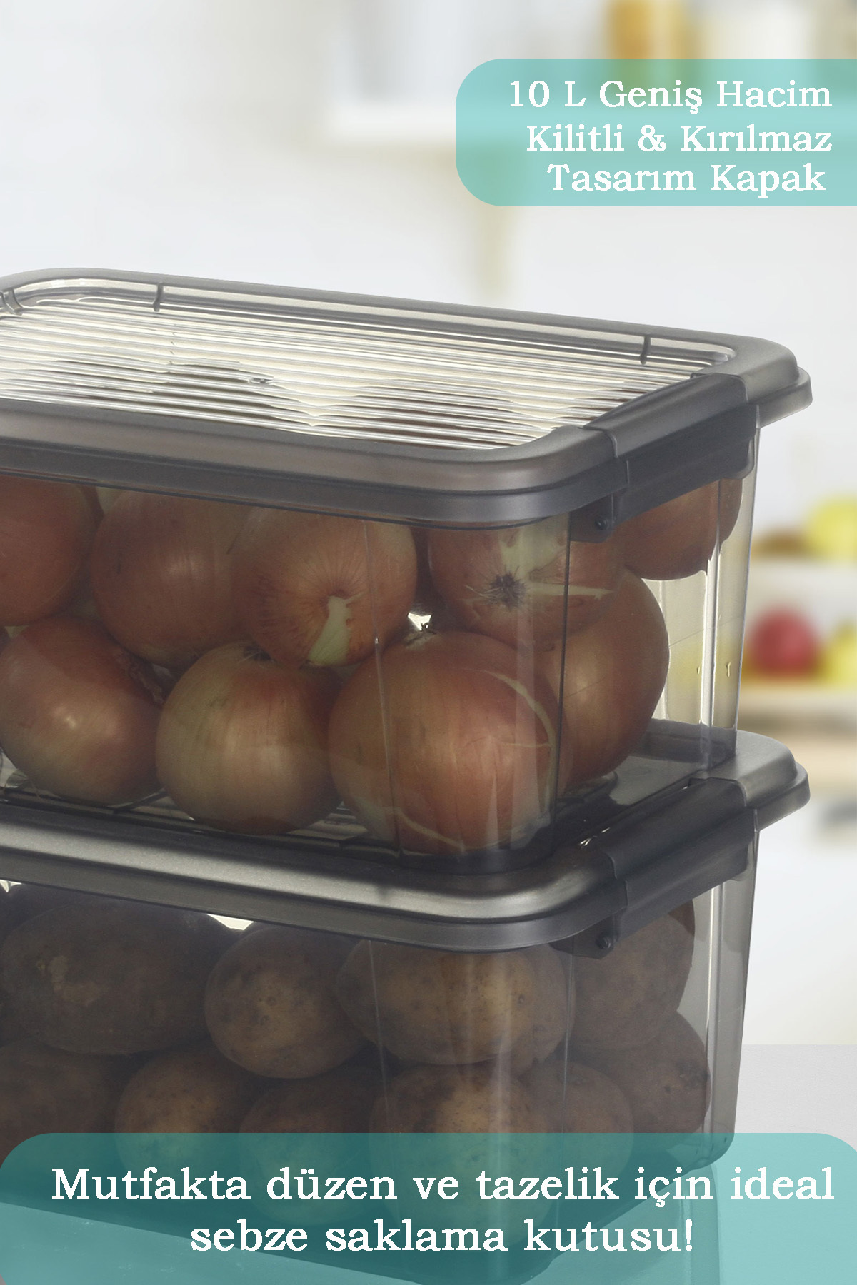 MOI 10 Litre Saklama Kutusu, mutfağınızda hem estetik hem fonksiyonel çözüm sunar.; Sebzelerinizi taze, alanınızı düzenli tutmak artık çok kolay!MOI 10 Litre Sebze Saklama Kabı, mutfakta hem düzen hem de tazelik arayanlar için özel olarak tasarlanmıştır.; Patates, soğan, havuç, limon, sarımsak gibi sebzeleri hijyenik ve düzenli şekilde saklamanızı sağlar.; Kaliteli plastik malzemeden üretilmiştir ve uzun ömürlüdür.; Kiler dolabı, mutfak rafı veya balkon alanlarında ideal kullanım sunar.; Ürün Hacmi ve Ölçüsü:2 Adet 10 Litre — 23,5 x 34 x 15,5 cm SiyahÜrün Özellikleri:Çok Amaçlı Kullanım: Patates, soğan, bakliyat, limon, sarımsak, kuru gıda ve daha fazlası için uygundur.; Kiler ve Baza Altı Uyumlu: Kompakt yapısı sayesinde dar alanlarda rahat kullanım sağlar.; Sağlam ve Dayanıklı Malzeme: Sert plastikten üretilmiştir, kırılmaya karşı dayanıklıdır.; Kolay Taşınabilir: Hafif yapısı sayesinde ev içinde kolayca yer değiştirebilirsiniz.; Tozdan Koruyan Kapak: Ürünlerinizi dış etkilerden korur, mutfağınızda hijyen sağlar.; Kolay Temizlik: Deterjanla veya ıslak bezle kolayca temizlenebilir.; Kullanım Alanları:• Mutfak düzenleyici• Kiler kutusu• Sebze ve meyve saklama kutusu• Erzak & bakliyat kabı• Balkon & depo saklama çözümü• Kamp & karavan gibi taşınabilir ortamlar