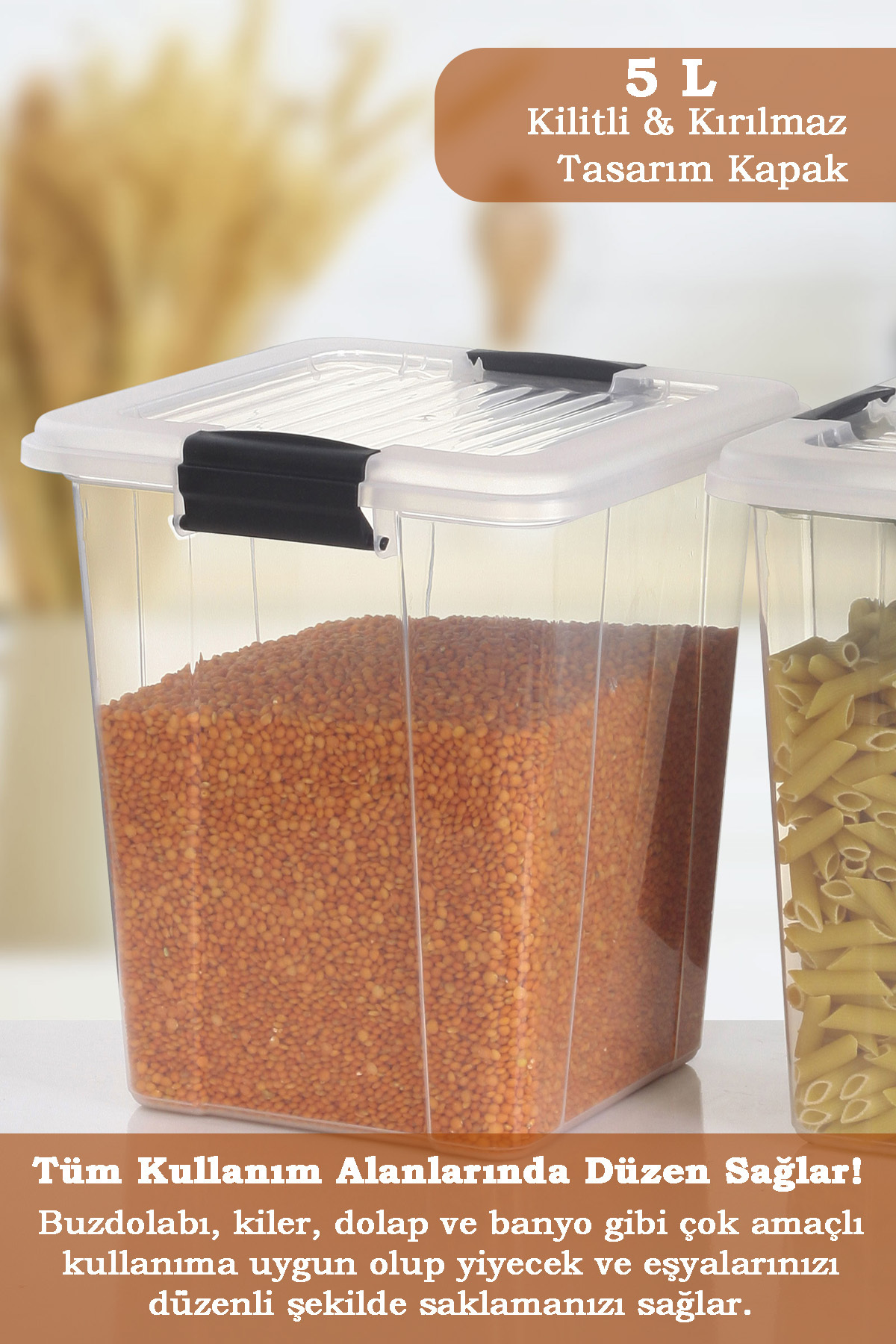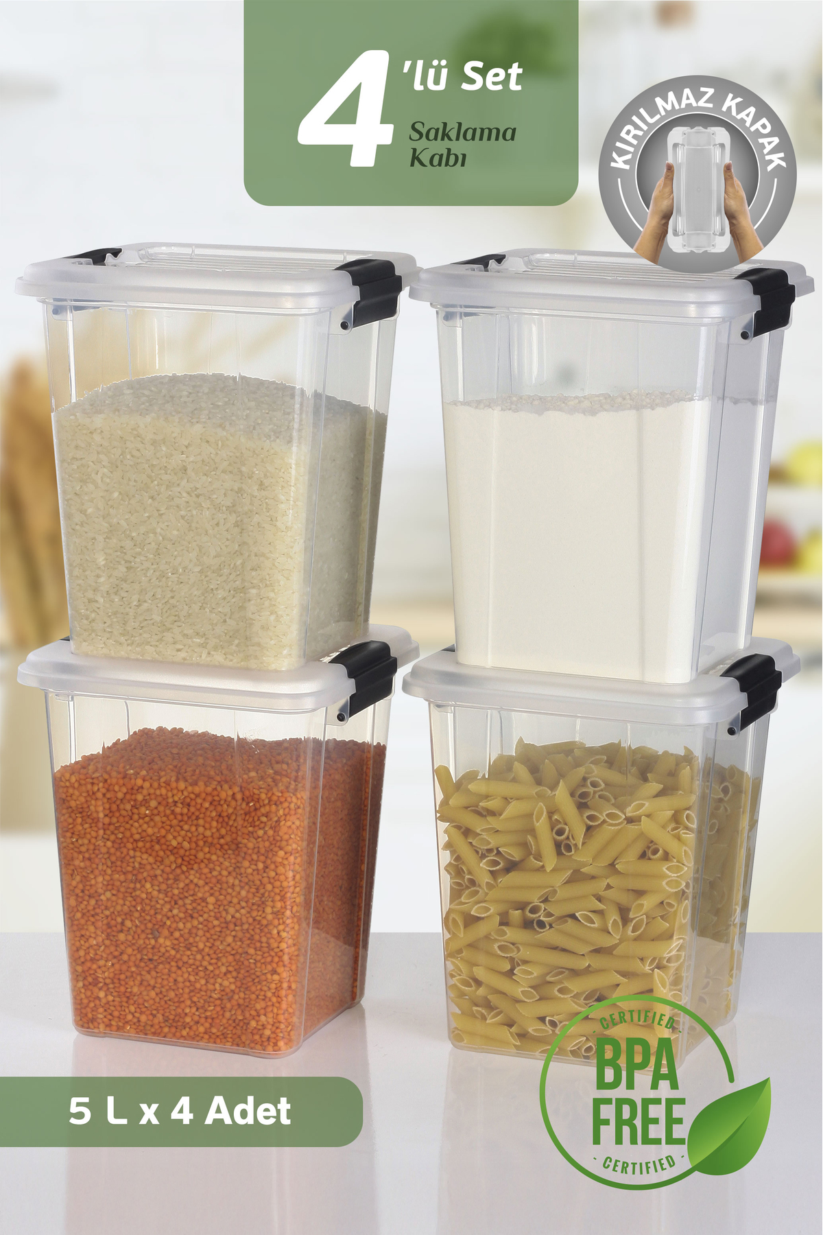 Düzenin ve pratikliğin markası Moi, mutfaktan banyoya, kilerden hobi alanlarına kadar hayatın her alanında size akıllı çözümler sunar.; Bu çok amaçlı derin saklama kutusu, un, bakliyat, erzak, deterjan, kırtasiye malzemeleri ve daha fazlasını güvenli ve hijyenik bir şekilde saklamanız için özel olarak tasarlandı.; Kilitli kapağı sayesinde hava ve nem geçirmez özelliğe sahiptir; bu da özellikle gıda ürünlerini uzun süre taze tutar.; Aynı zamanda deterjan ve temizlik ürünlerinin kokusunun dışarı çıkmasını engeller.; Şeffaf gövdesi ile içerisindeki ürünleri kolayca görebilir, ihtiyacınızı anında tespit edebilirsiniz.; Sadece mutfakta değil; kedi ve köpek maması, hırdavat malzemeleri, kırtasiye ve hobi ürünleri gibi birçok farklı alanda da güvenle kullanabilirsiniz.; İstiflenebilir ve ergonomik tasarımı, dar alanlarda bile maksimum düzen sağlar.; Ürün Özellikleri:• Hacim: 5 L – 4 Adet Derin Erzak Saklama Kabı – Şeffaf• Ölçüler:◦ 5 L: 19,1 x 19,1 x 22,9 cmMalzeme: Sağlığa uygun, BPA içermeyen dayanıklı plastik• Kapak: Kilitli, hava ve sızdırma geçirmez yapı• Gövde: Şeffaf – kolay içerik takibi• Kullanım Alanları:◦ Un, şeker, tuz gibi temel gıdalar◦ Kuru bakliyat çeşitleri (mercimek, nohut, fasulye vb.; )◦ Toz deterjan ve temizlik ürünleri◦ Kedi ve köpek maması◦ Hırdavat, kırtasiye ve hobi malzemeleri• İstiflenebilir tasarım: Alan tasarrufu sağlar• Düzenli, hijyenik ve fonksiyonel bir yaşam alanı için pratik bir yardımcı!
