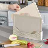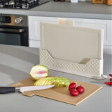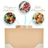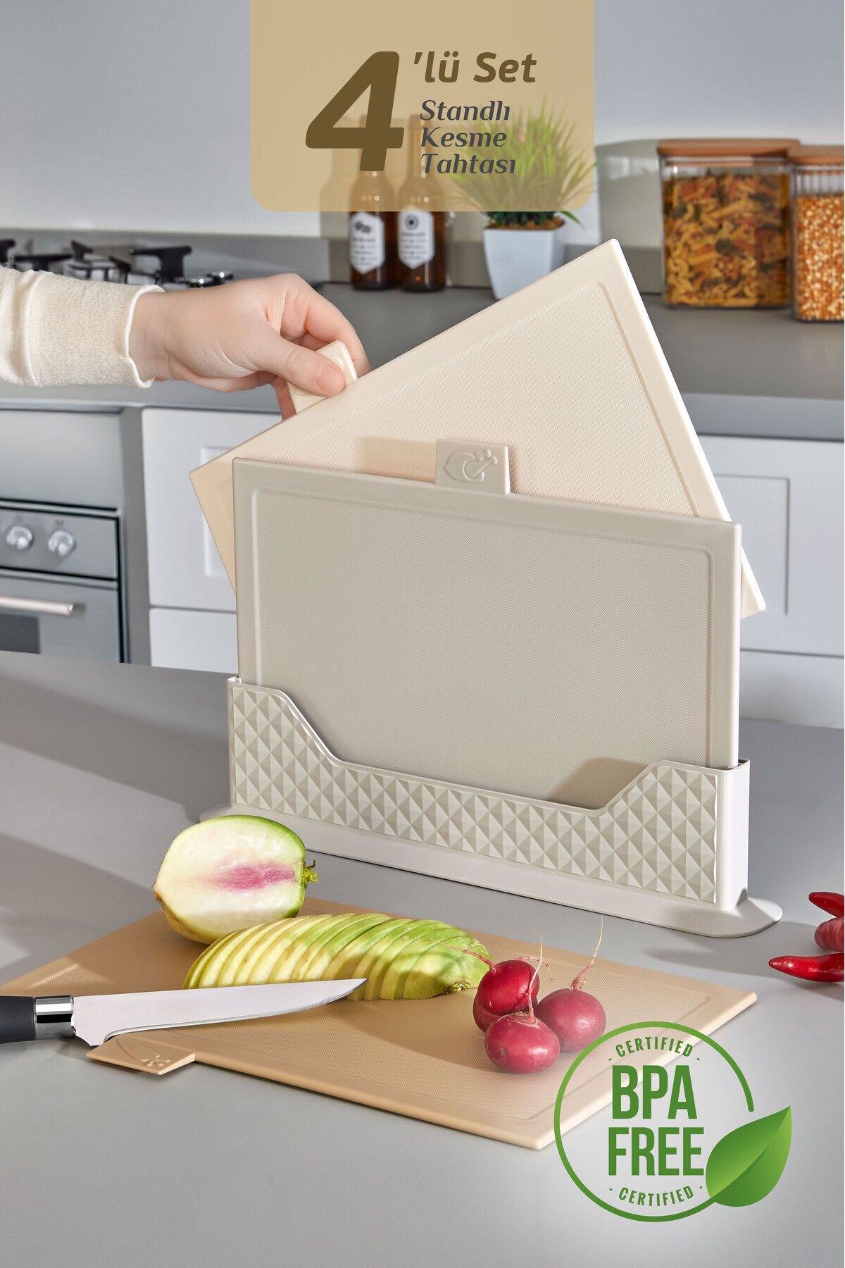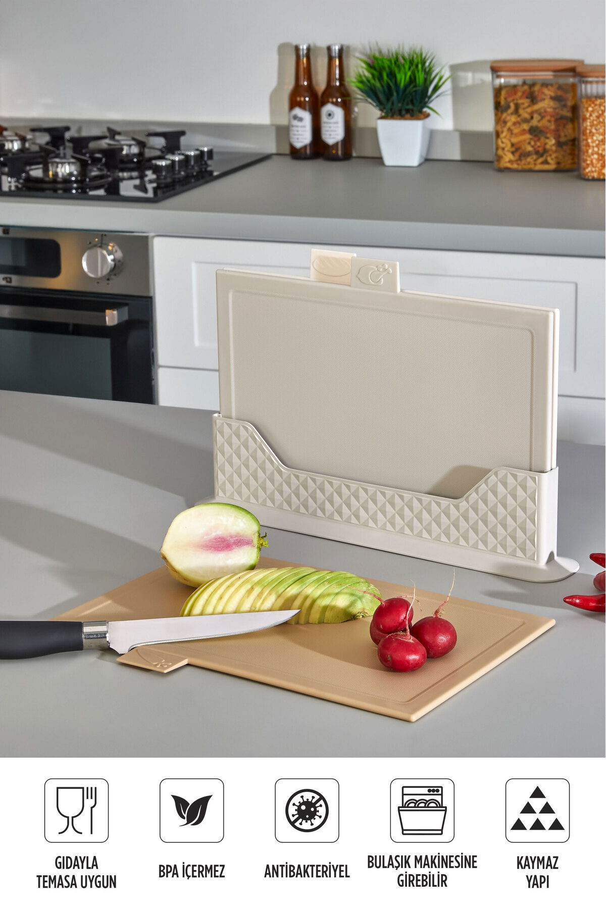 Ürün Ölçüleri ve Paket İçeriği: Bej1 adet yatay kesme tahtası standı: 3 adet kesme tahtası: MOI 3’lü Standlı Kesme Tahtası Seti, mutfakta hijyen ve işlevselliği bir araya getiren özel bir tasarımdır.; Her biri farklı gıda grupları için ikonlarla etiketlenmiş olan bu tahtalar, çapraz bulaşmayı önleyerek daha sağlıklı yemek hazırlığı yapmanıza yardımcı olur.; 🔸 3 Ayrı Tahta, 3 Ayrı GörevEkmek, sebze/meyve ve çiğ et için özel olarak ayrılmış kesme tahtaları sayesinde mutfakta maksimum hijyen sağlar.; Üst kısmındaki ikonlar sayesinde hangi tahtanın hangi gıdada kullanılacağı net bir şekilde anlaşılır.; Kaymaz ve Sağlam YüzeyYüzey yapısı bıçak kaymalarını azaltır ve güvenli doğrama sunar.; Dayanıklı yapısıyla uzun süreli kullanım sağlar.; Modern ve Kompakt StandTahtaları düzenli ve hijyenik şekilde muhafaza etmenizi sağlayan özel standı, mutfak tezgahınızda hem az yer kaplar hem de şık bir görüntü sunar.; BPA İçermez – Gıda Dostu MalzemeGüvenle kullanabileceğiniz kaliteli plastik malzeme, sağlığınızı ön planda tutar.; Kolayca elde ya da bulaşık makinesinde yıkanabilir.; Kullanım Alanları:✔ Ev mutfakları✔ Kamp, karavan, piknik✔ Restoran ya da butik mutfaklar✔ Yeni ev hediyesiÜrün Özellikleri:• Set İçeriği: 3 adet renk kodlu kesme tahtası + 1 adet stand• Malzeme: Dayanıklı ve BPA içermeyen plastik• Kullanım: Çok amaçlı doğrama (et, sebze, ekmek)• Temizlik: Bulaşık makinesine uygundur• Yer tasarrufu sağlayan tasarımMOI ile mutfağınızda düzen, sağlık ve stil bir arada! Bu kompakt set sayesinde mutfağınızda hem profesyonel bir görünüm elde edin hem de günlük yemek hazırlığınızı daha hijyenik hale getirin.