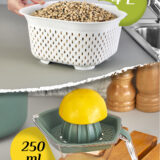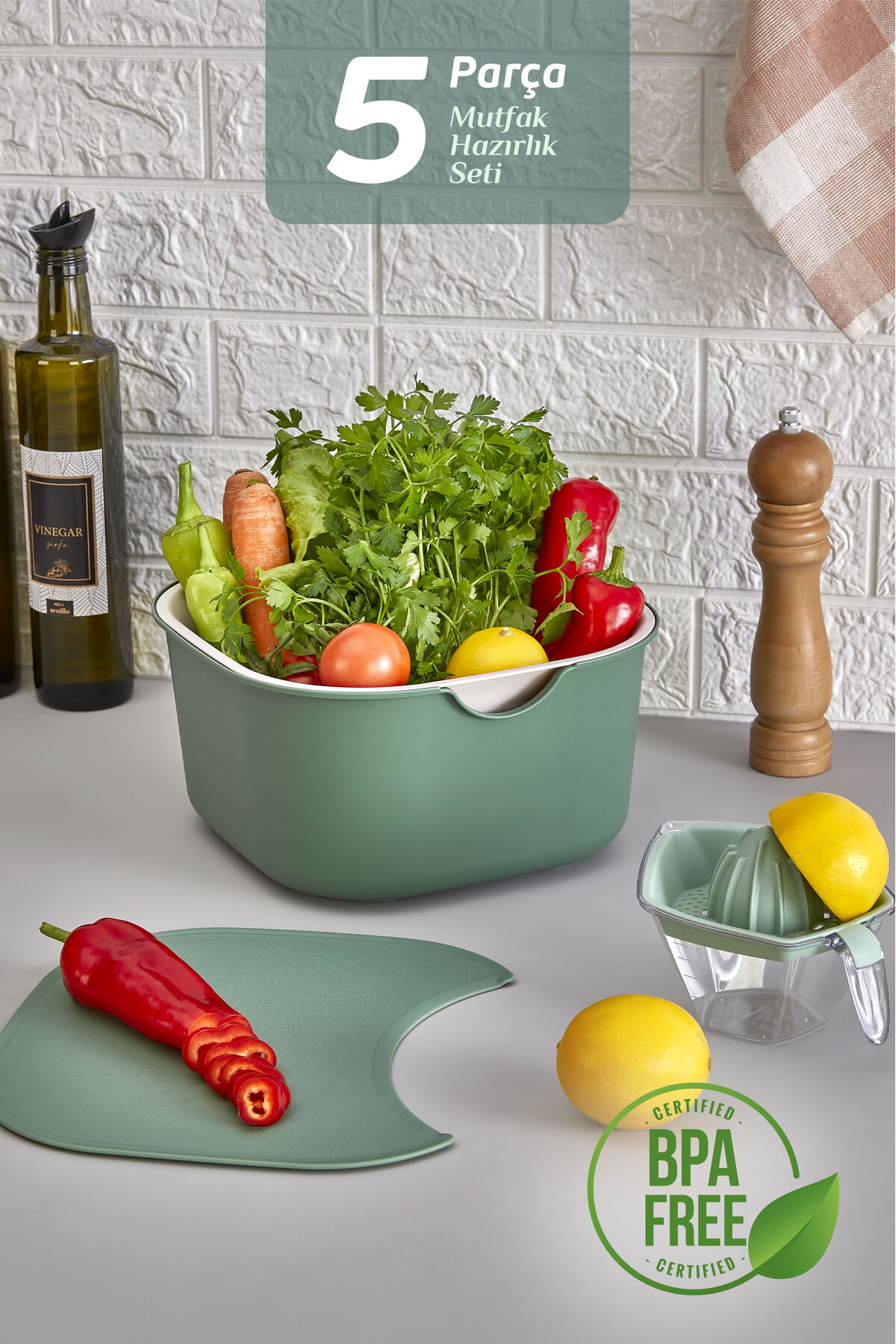 Ürün Ölçüleri ve Paket İçeriği: Mint1 adet karıştırma kabı: 24 x 24 x 12,5 cm (4 Litre)1 adet süzgeç: 23,5 x 23,5 x 12 cm 1 adet kesim panosu: 24 x 22 x 0,3 cm 1 adet ölçekli limon sıkacağı: 12 x 12 x 10 cm (250 ml)5 Parça Kompakt Mutfak Seti – Karıştırma Kabı, Süzgeç, Kesme Tahtası, Limon Sıkacağı ve KasePratikliği ve çok yönlülüğü bir araya getiren bu özel set, hem günlük mutfak ihtiyaçlarınız hem de kamp, piknik ve tatil gibi dış mekân kullanımları için ideal!Kompakt ve Modüler Tasarım:Tüm parçalar birbirine geçerek yer kaplamaz, dolap içlerinde veya taşıma sırasında minimum alan kullanır.; Küçük mutfaklar için ideal bir çözüm sunar.5 Fonksiyon Bir Arada:Karıştırma kabı ile salatalarınızı rahatça hazırlayın.; Süzgeçle sebzelerinizi kolayca yıkayıp süzün.; Kesme tahtası ile doğrama işlerinizi pratik hale getirin.; Limon sıkacağı ile taze limon suyu her an elinizin altında.; Kâse ile servis ve saklama çözümleri!Kamp ve Piknik Dostu:Hafif yapısı ve kompakt tasarımı sayesinde yanınızda kolayca taşıyabilirsiniz.; Açık hava aktivitelerinde yemek hazırlamak hiç bu kadar kolay olmamıştı.; Kolay Temizlik – Dayanıklı Malzeme:Kaliteli plastikten üretilmiştir.; BPA içermez.; Temizliği kolaydır, elde veya bulaşık makinesinde yıkanabilir.; MOI kalitesiyle, hem mutfağınızda hem de dış mekânlarda kullanım kolaylığı sağlayan bu set, çok yönlü yapısıyla vazgeçilmeziniz olacak!