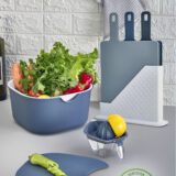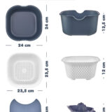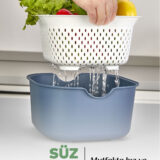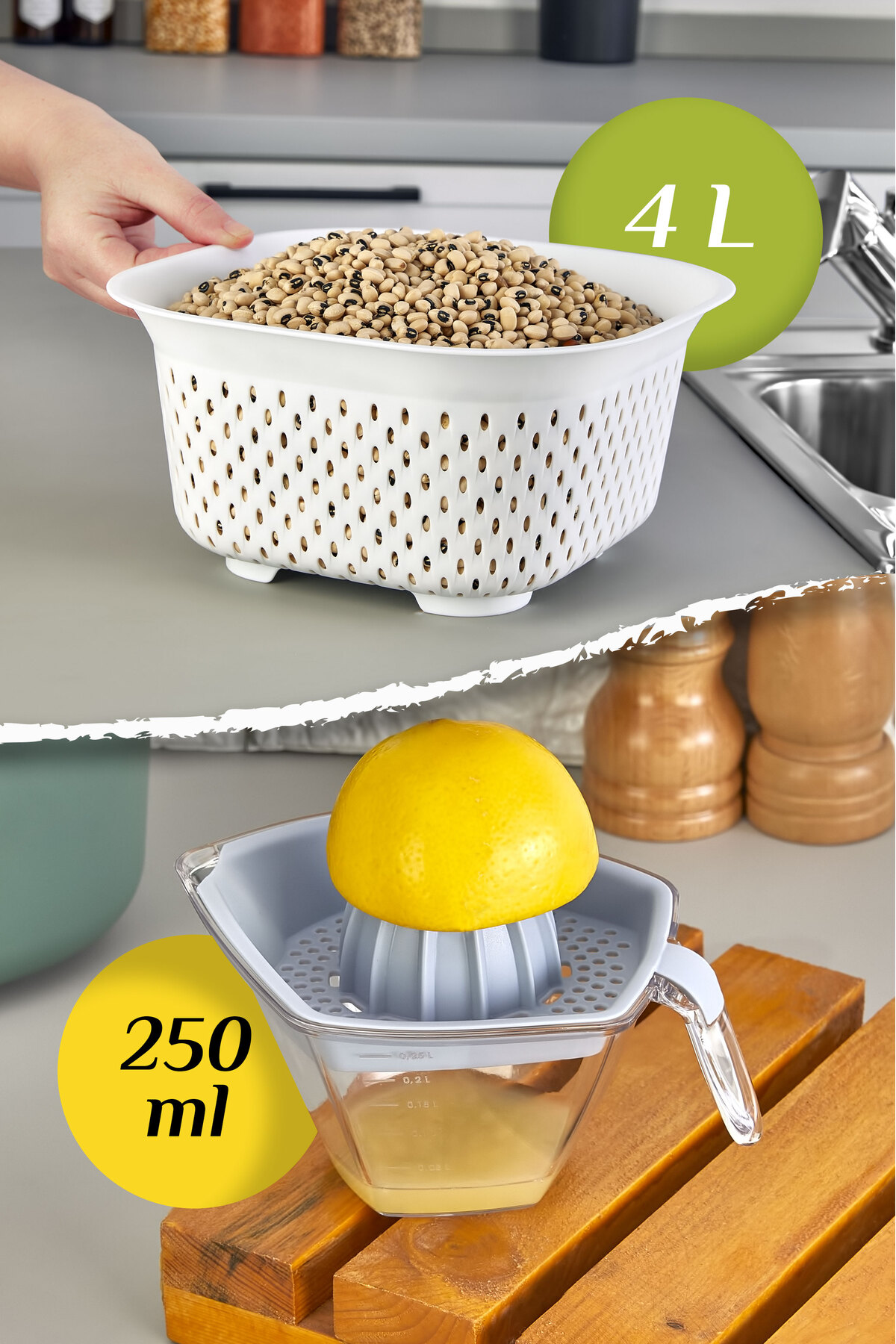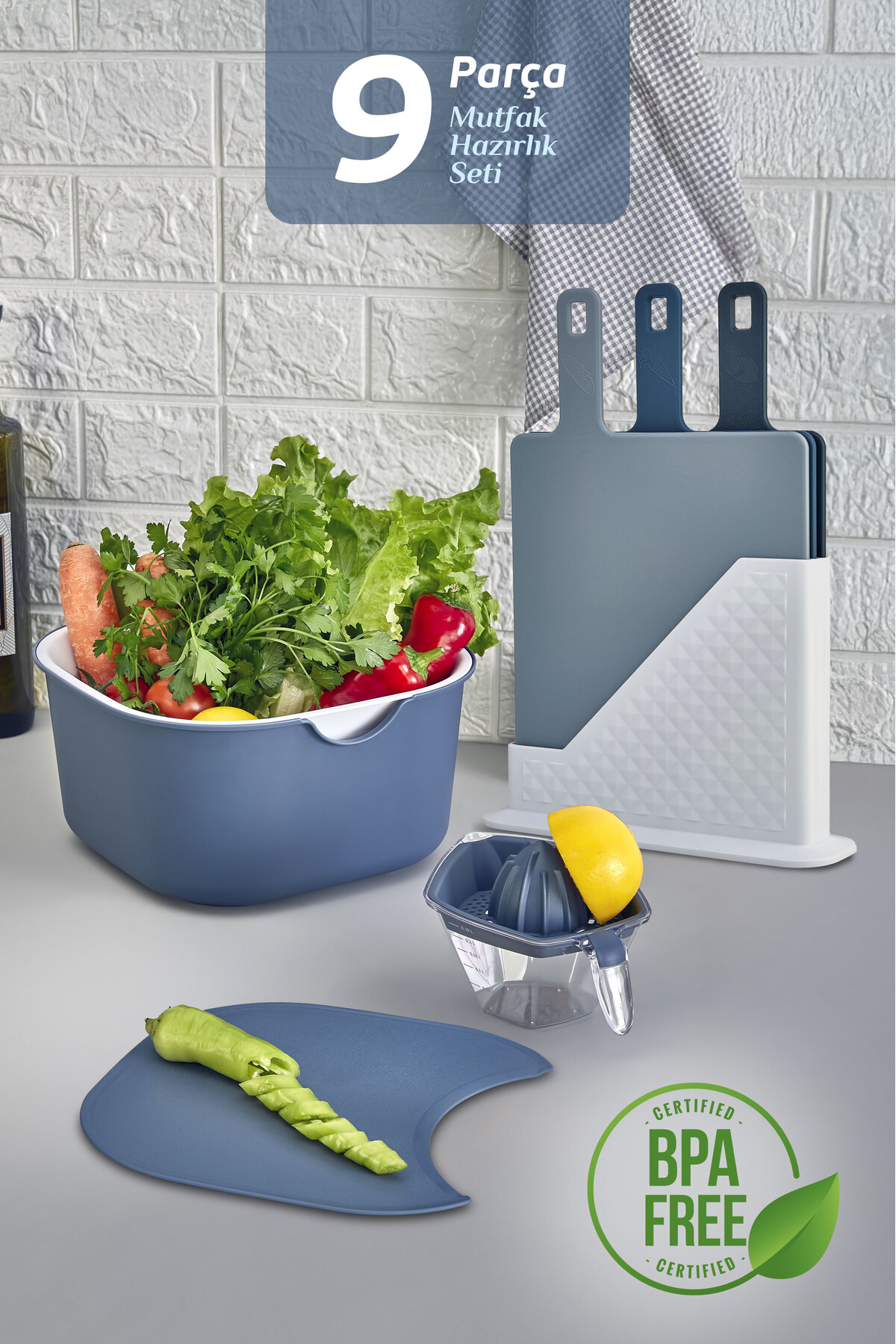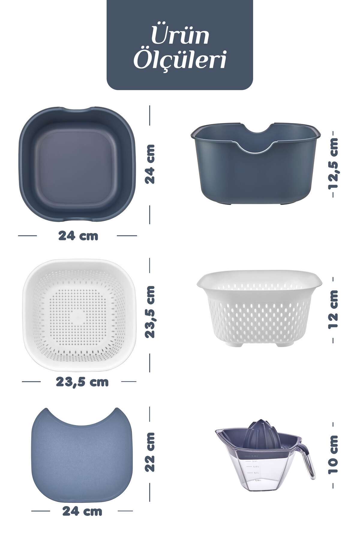 Ürün Ölçüleri ve Paket İçeriği: Mavi1 adet karıştırma kabı: 24 x 24 x 12,5 cm (4 Litre)1 adet süzgeç: 23,5 x 23,5 x 12 cm 1 adet kesim panosu: 24 x 22 x 0,3 cm 1 adet ölçekli limon sıkacağı: 12 x 12 x 10 cm (250 ml)1 adet kesme tahtası standı 24 x 7 x 17 cm3 adet dik kesme tahtası 20 x 32 x 3,5 cmMOI kalitesiyle, hem mutfağınızda hem de dış mekânlarda kullanım kolaylığı sağlayan bu set, çok yönlü yapısıyla vazgeçilmeziniz olacak!5 Parça Kompakt Mutfak Seti – Karıştırma Kabı, Süzgeç, Kesme Tahtası, Limon Sıkacağı ve Kase Pratikliği ve çok yönlülüğü bir araya getiren bu özel set, hem günlük mutfak ihtiyaçlarınız hem de kamp, piknik ve tatil gibi dış mekân kullanımları için ideal!Kompakt ve Modüler Tasarım:Tüm parçalar birbirine geçerek yer kaplamaz, dolap içlerinde veya taşıma sırasında minimum alan kullanır.; Küçük mutfaklar için ideal bir çözüm sunar.5 Fonksiyon Bir Arada:Karıştırma kabı ile salatalarınızı rahatça hazırlayın.; Süzgeçle sebzelerinizi kolayca yıkayıp süzün.; Kesme tahtası ile doğrama işlerinizi pratik hale getirin.; Limon sıkacağı ile taze limon suyu her an elinizin altında.; Kâse ile servis ve saklama çözümleri!4’lü Standlı Kesme Tahtası Mutfakta düzen, hijyen ve konforu bir araya getiren bu 3’lü kesme tahtası seti, farklı gıda grupları için özel olarak tasarlanmıştır.; Et, sebze ve balık gibi farklı ürünleri çapraz bulaş olmadan doğrayabilir, hijyenik bir hazırlık süreci sağlayabilirsiniz.; Kaymaz taban tasarımı sayesinde güvenli kullanım sağlar iken modern ve şık saklama standı ile yer kaplamaz.; Kolay Temizlik – Dayanıklı Malzeme:Kaliteli plastikten üretilmiştir.; BPA içermez.; Temizliği kolaydır, elde veya bulaşık makinesinde yıkanabilir.