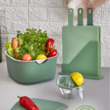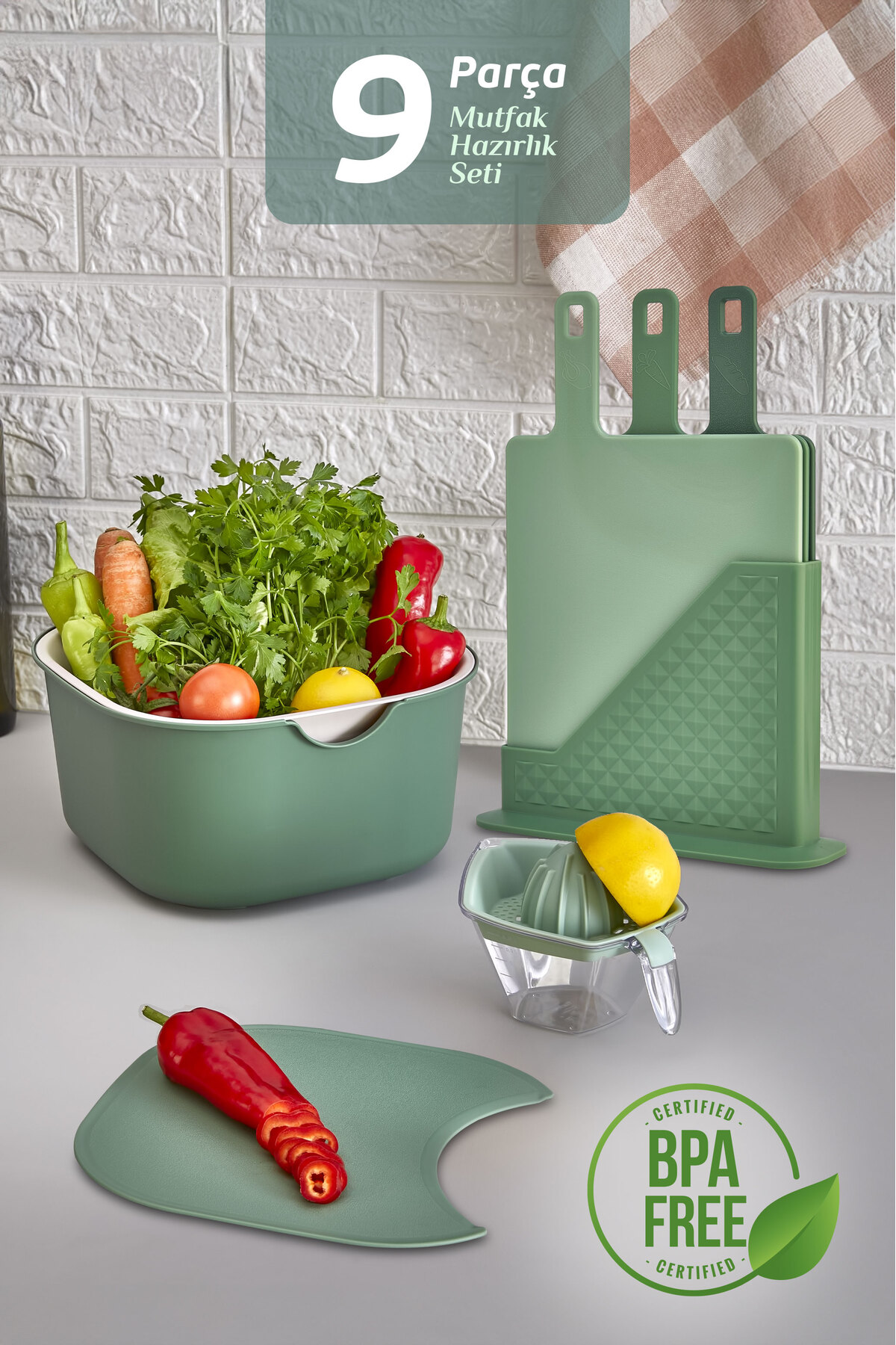Ürün Ölçüleri ve Paket İçeriği: Mavi1 adet karıştırma kabı: 24 x 24 x 12,5 cm (4 Litre)1 adet süzgeç: 23,5 x 23,5 x 12 cm 1 adet kesim panosu: 24 x 22 x 0,3 cm 1 adet ölçekli limon sıkacağı: 12 x 12 x 10 cm (250 ml)1 adet kesme tahtası standı 24 x 7 x 17 cm3 adet dik kesme tahtası 20 x 32 x 3,5 cmMOI kalitesiyle, hem mutfağınızda hem de dış mekânlarda kullanım kolaylığı sağlayan bu set, çok yönlü yapısıyla vazgeçilmeziniz olacak!5 Parça Kompakt Mutfak Seti – Karıştırma Kabı, Süzgeç, Kesme Tahtası, Limon Sıkacağı ve Kase Pratikliği ve çok yönlülüğü bir araya getiren bu özel set, hem günlük mutfak ihtiyaçlarınız hem de kamp, piknik ve tatil gibi dış mekân kullanımları için ideal!Kompakt ve Modüler Tasarım:Tüm parçalar birbirine geçerek yer kaplamaz, dolap içlerinde veya taşıma sırasında minimum alan kullanır.; Küçük mutfaklar için ideal bir çözüm sunar.5 Fonksiyon Bir Arada:Karıştırma kabı ile salatalarınızı rahatça hazırlayın.; Süzgeçle sebzelerinizi kolayca yıkayıp süzün.; Kesme tahtası ile doğrama işlerinizi pratik hale getirin.; Limon sıkacağı ile taze limon suyu her an elinizin altında.; Kâse ile servis ve saklama çözümleri!4’lü Standlı Kesme Tahtası Mutfakta düzen, hijyen ve konforu bir araya getiren bu 3’lü kesme tahtası seti, farklı gıda grupları için özel olarak tasarlanmıştır.; Et, sebze ve balık gibi farklı ürünleri çapraz bulaş olmadan doğrayabilir, hijyenik bir hazırlık süreci sağlayabilirsiniz.; Kaymaz taban tasarımı sayesinde güvenli kullanım sağlar iken modern ve şık saklama standı ile yer kaplamaz.; Kolay Temizlik – Dayanıklı Malzeme:Kaliteli plastikten üretilmiştir.; BPA içermez.; Temizliği kolaydır, elde veya bulaşık makinesinde yıkanabilir.