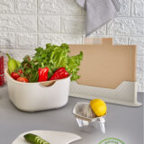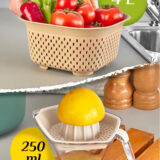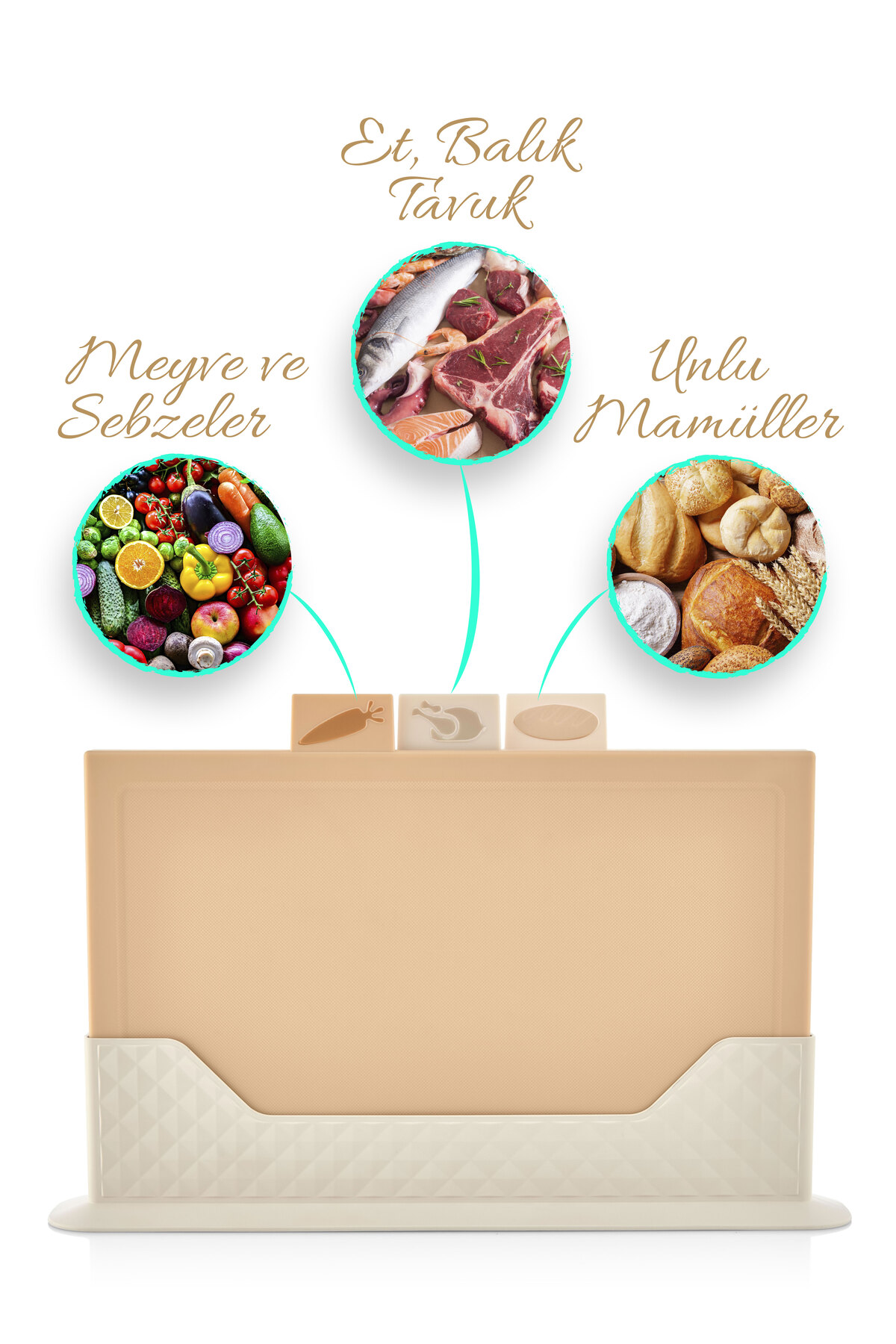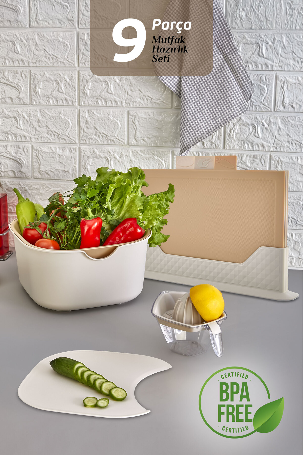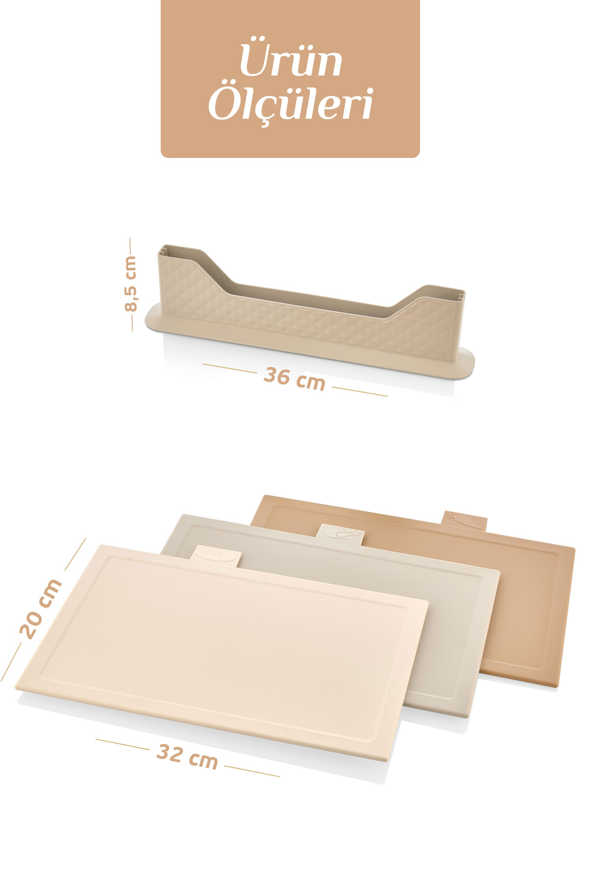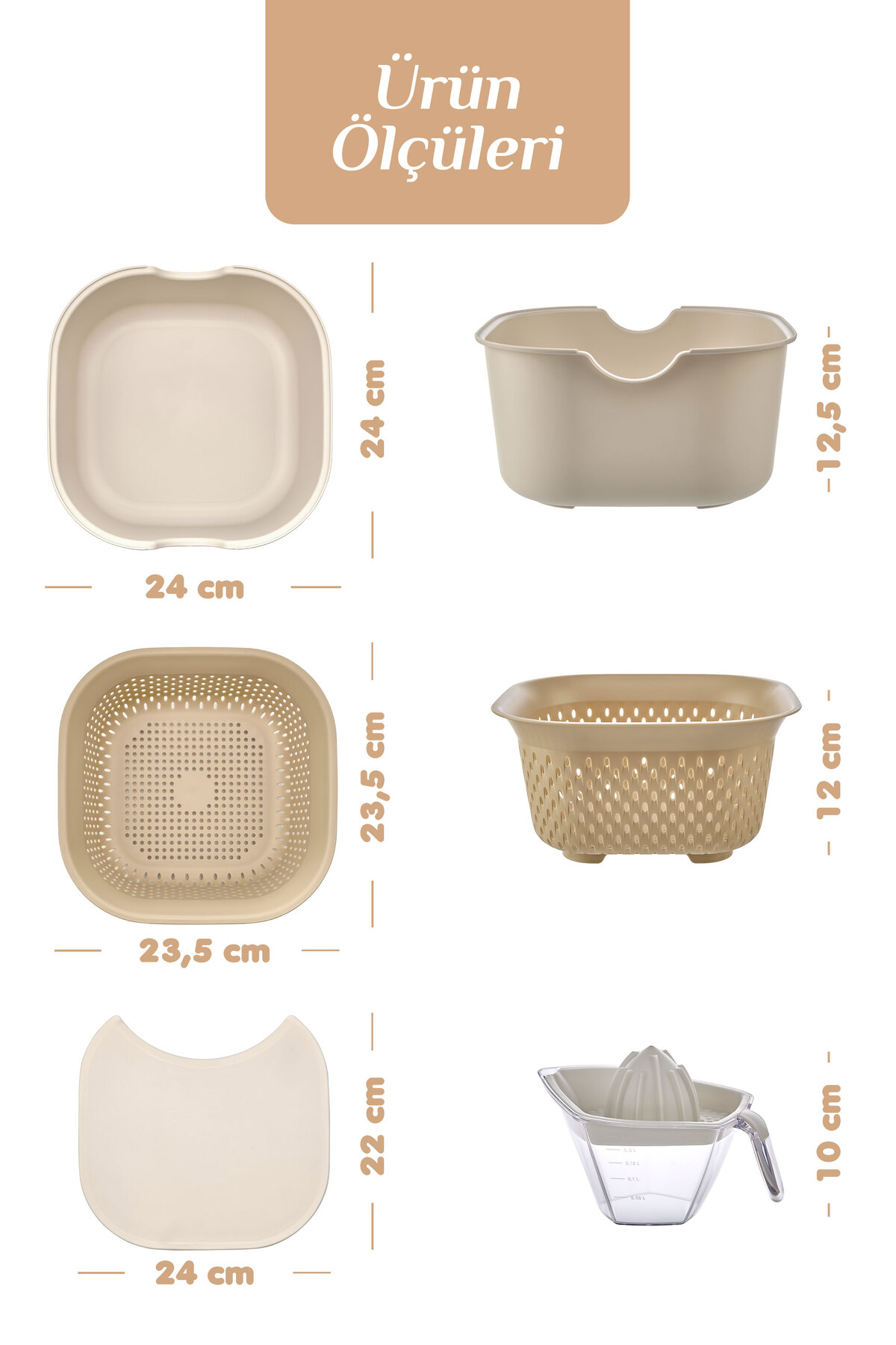 Ürün Ölçüleri ve Paket İçeriği: Yeşi l1 adet karıştırma kabı: 24 x 24 x 12,5 cm (4 Litre)1 adet süzgeç: 23,5 x 23,5 x 12 cm 1 adet kesim panosu: 24 x 22 x 0,3 cm 1 adet ölçekli limon sıkacağı: 12 x 12 x 10 cm (250 ml)1 adet kesme tahtası standı: 3 adet yatay kesme tahtası: MOI kalitesiyle, hem mutfağınızda hem de dış mekânlarda kullanım kolaylığı sağlayan bu set, çok yönlü yapısıyla vazgeçilmeziniz olacak!5 Parça Kompakt Mutfak Seti – Karıştırma Kabı, Süzgeç, Kesme Tahtası, Limon Sıkacağı ve Kase Pratikliği ve çok yönlülüğü bir araya getiren bu özel set, hem günlük mutfak ihtiyaçlarınız hem de kamp, piknik ve tatil gibi dış mekân kullanımları için ideal!Kompakt ve Modüler Tasarım:Tüm parçalar birbirine geçerek yer kaplamaz, dolap içlerinde veya taşıma sırasında minimum alan kullanır.; Küçük mutfaklar için ideal bir çözüm sunar.5 Fonksiyon Bir Arada:Karıştırma kabı ile salatalarınızı rahatça hazırlayın.; Süzgeçle sebzelerinizi kolayca yıkayıp süzün.; Kesme tahtası ile doğrama işlerinizi pratik hale getirin.; Limon sıkacağı ile taze limon suyu her an elinizin altında.; Kâse ile servis ve saklama çözümleri!4’lü Standlı Kesme Tahtası Mutfakta düzen, hijyen ve konforu bir araya getiren bu 3’lü kesme tahtası seti, farklı gıda grupları için özel olarak tasarlanmıştır.; Et, sebze ve balık gibi farklı ürünleri çapraz bulaş olmadan doğrayabilir, hijyenik bir hazırlık süreci sağlayabilirsiniz.; Kaymaz taban tasarımı sayesinde güvenli kullanım sağlar iken modern ve şık saklama standı ile yer kaplamaz.; Kolay Temizlik – Dayanıklı Malzeme:Kaliteli plastikten üretilmiştir.; BPA içermez.; Temizliği kolaydır, elde veya bulaşık makinesinde yıkanabilir.;